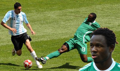 ON DUTY ••• Late Adefemi Olubayo attempts to stop Argentina forward Angel Di Maria in the final of Beijing Olympics, China. Nigeria lost the Olympic Gold 1-0 to Angentina.