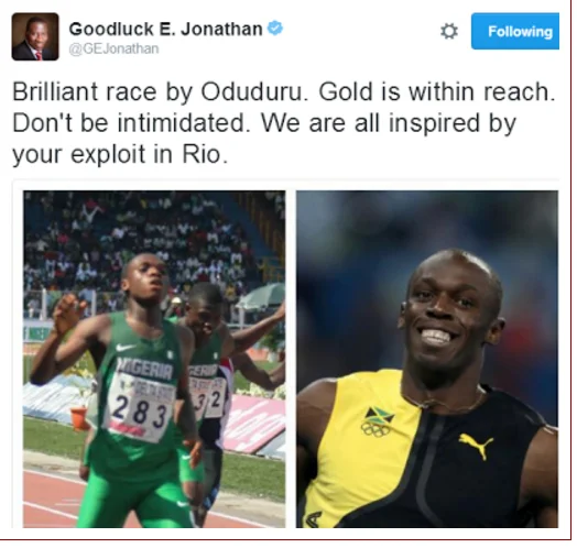 Former President Goodluck Jonathan and Senator Ben Murray-Bruce have charged Nigerian athlete, Ejowvokoghene Oduduru to charge on and win a gold model in the Rio Olympics.